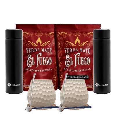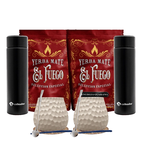 Yerba Mate Set for Two: El Fuego 2x500g + 2x Thermos LED + 2x Calabash + 2x Bombilla