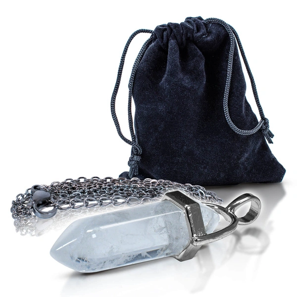 Pendant with rock crystal in pouch + chain