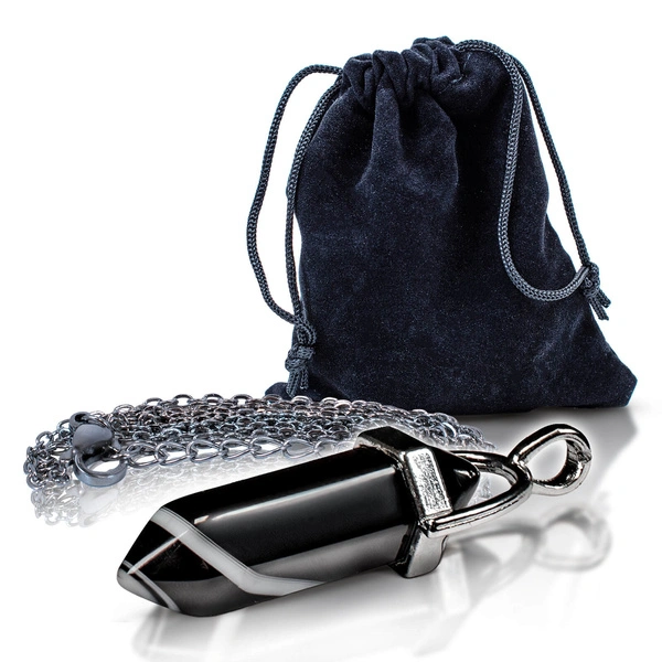 Form: polished black agate in a metal frame (with chain), packed in black pouch