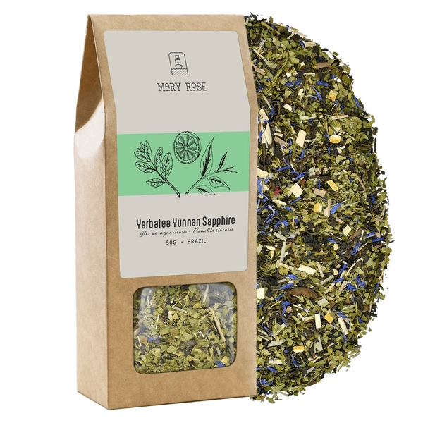 Mary Rose Yunnan Sapphire yerbatea combines Brazilian green yerba mate with the intense flavour of yunnan black tea. This composition also includes cornflower petals, lemon peel, dried chokeberry and lemongrass.